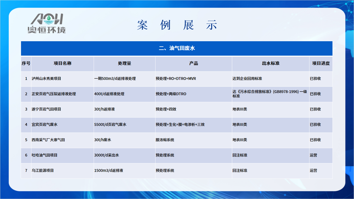 在油氣田廢水處理行業(yè),奧恒環(huán)保擁有國內(nèi)多個區(qū)塊不同水質(zhì)的工程案例,具有相當(dāng)成熟的工程應(yīng)用經(jīng)驗。